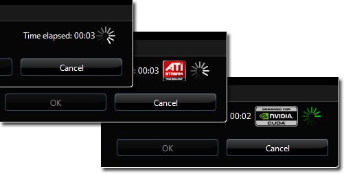 Во время кодирования, в углу окна отображается информация о работающей в данный момент технологии: отсутствие какого-либо логотипа обозначает работу одного лишь центрального процессора, логотипы ATI STREAM или NVIDIA CUDA означают работу соответствующих архитектур.