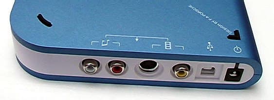 На другой боковой грани находятся пять гнёзд, предназначенных для ввода сигнала: композитный и S-Video вход, входы для двух каналов звука и FireWire-порт. Ни микропереключателя выбора типа источника, ни светодиодных индикаторов, которые присутствуют в модели MovieBox DV, здесь нет.