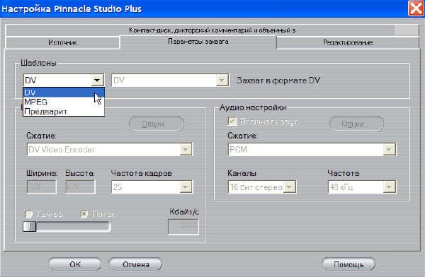 При захвате через DV-интерфейс предлагается выбрать качество захвата: предварительное или полное. При полном качестве возможно два типа сжатия: DV и MPEG.