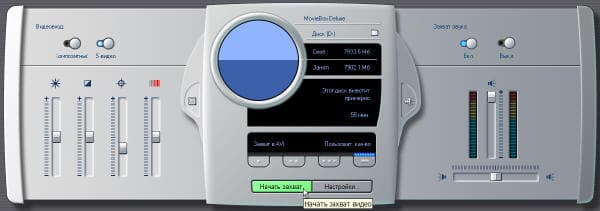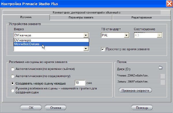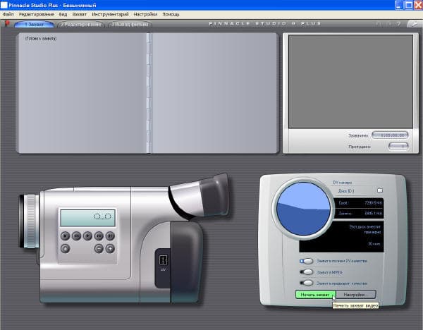 Как вы уже знаете, Studio MovieBox Deluxe может работать с разными типами источников видеоматериала, аналоговым и цифровым. Так, например, выглядит интерфейс программы Studio Plus 9 при захвате изображения с DV камеры.