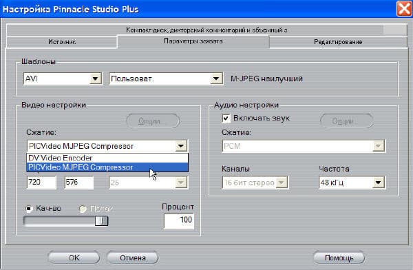 Для аналоговых средств захвата Studio Plus 9 предлагает три готовых варианта качества – среднее, хорошее и наилучшее, и настраиваемый пользовательский вариант. Причём в последнем случае пользователю доступно существенно больше настроек, в том числе и выбор кодека.