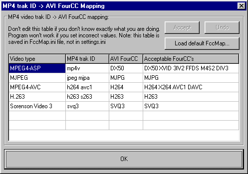 Если пользователя по каким-то причинам такая запись не устраивает, можно изменить ее, войдя в Settings и далее в "MP4 Track ID -> AVI Four CC Mapping"