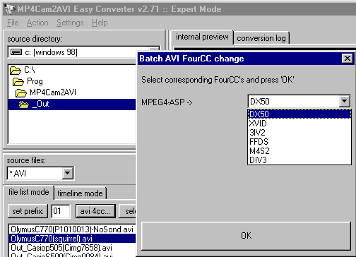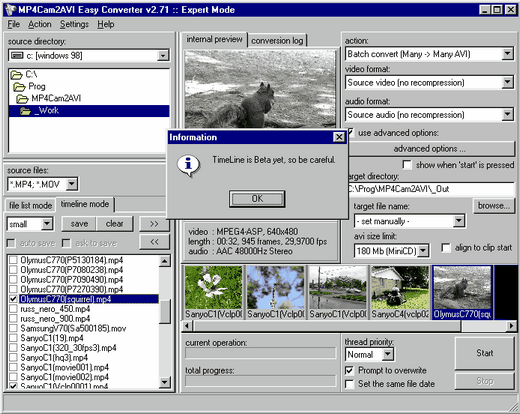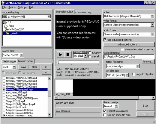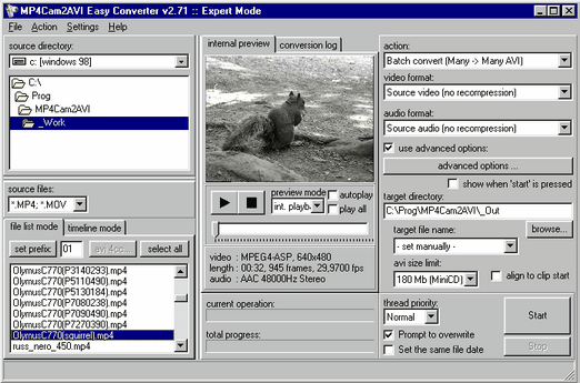 Затем выбираем необходимые файлы, нажимаем кнопку "Start", в результате в целевой каталоге появятся перепакованные файлы с теми же именами, но с расширением AVI.
