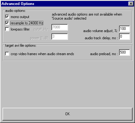 Окно Advanced Options содержит дополнительные настройки для обработки звука (audio options), а также некоторые технические настройки. Дополнительная обработка звука (фильтр нижних частот, громкость) работает только в режимах PCM или MP3 и недоступна в режиме Source Audio.