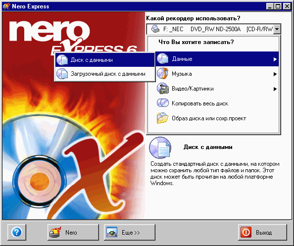 После шага 3 на выходе мы получаем готовый DivX-совместимый "фильм" в AVI контейнере, который можно записывать на CD или DVD диск. Сделать это можно, например, с помощью программ Nero Burning ROM или Nero Express (на вопрос "Что вы хотите записать?" нужно ответить "Диск с данными"):