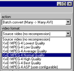 Наконец, переходим к режиму Expert. Здесь появляется еще одна опция Video Format. Теперь появляется возможность перекодировать видео в формат XviD MPEG-4 ASP (c помощью библиотеки xvidcore.dll).