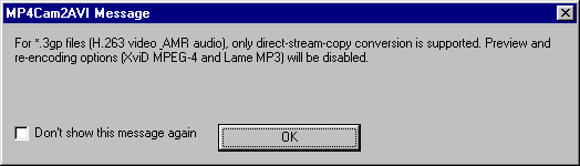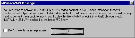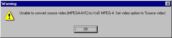 Некоторые продвинутые читатели наверное уже обратили внимание, что в окне "MP4 Track ID -> AVI Four CC Mapping" помимо MJPEG и MPEG4-ASP указан еще и MPEG4-AVC. Неужели программа умеет работать и с видеофайлами MPEG4 Advanced Video Codec? Да, это так версия программы, вышедшая буквально накануне выхода статьи, научилась делать и это. Правда, сейчас она может только перепаковывать файлы, оставляя видео нетронутым, а при попытке включить перекодирование выдается предупреждение,