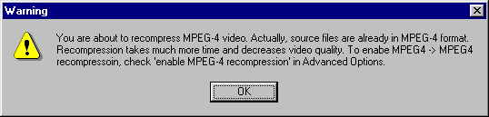 На птичке "Enable MPEG4 Recompression" остановимся подробнее. Как мы уже подчеркивали, повторное перекодирование MPEG4 видео крайне нежелательно, его по возможности необходимо избегать. Именно поэтому настройки, связанные с перекодированием видео, были спрятаны в режим Expert. Помимо этого, мы ввели дополнительную птичку "Enable MPEG4 Recompression", без которой процесс повторного кодирования MPEG-4 ASP не запустится, будет выдано предупреждение: