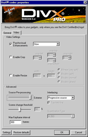 Настройка кодека DivX достаточно подробно описана в статье "DivX: особенности сжатия видео в домашних условиях", так что здесь подробно останавливаться на этом вопросе мы не будем. В нашем случае DivX настраивается для простого однопроходного кодирования. Нас, в первую очередь, интересуют два параметра битрейт (bitrate) и интервал между ключевыми кадрами (keyframe interval, он же размер GOP).