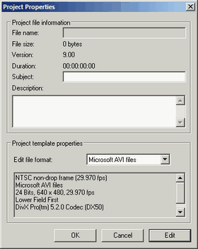 В настройках проекта Ulead в качестве выходного формата обязательно указываем контейнер AVI, кодек DivX5 (даже если в системе присутствуют другие MPEG-4 кодеки) и формат аудио MP3 (для того, чтобы звук воспроизводился на DVD-MPEG-4 плейере). Также проверяем соответствие частоты кадров (Frame rate) и размера кадра (Frame size) "входному" формату (иначе прямопотоковое копирование не будет работать). Входные параметры видео можно узнать, посмотрев File Info в VirtualDub (см. ниже) или в MP4Cam2AVI.