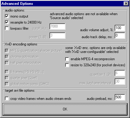 Нижняя из них, "Resize to 320x240" предназначена для создания видеофайлов для просмотра на КПК и других мобильных устройствах, которые могут просто не потянуть воспроизведение файла с разрешением 640x480. Данная опция пока еще находится в состоянии Beta, поэтому могут быть проблемы с ее работой.