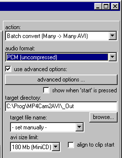 С помощью программы MP4Cam2AVI подготавливаем видеоролики, перепаковываем их из контейнера MP4 или MOV в AVI , звук при этом перекодируем в PCM. Это уже было подробно описано в статье "Обработка видеозаписей MPEG4 фотовидеокамер. Этапы от камеры до DVD плеера шаг за шагом" (ВТОРОЙ ПУТЬ), поэтому здесь приводим только основные настройки MP4Cam2AVI: