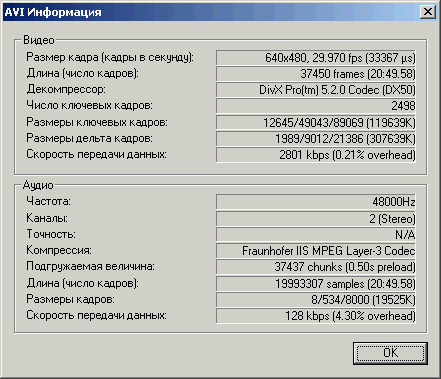 Примечание. В случае, если в системе установлено несколько MPEG-4 кодеков, они могут конфликтовать друг с другом (например, если помимо DivX5, установлены еще XviD, FFDShow, или какой-нибудь Codecpack (что чаще всего бывает источником проблем). Для корректной работы нам нужно, чтобы наш файл обрабатывался именно кодеком DivX5, а не каким либо другим. Это можно проверить, например, так откройте файл в VirtualDub и посмотрите FileInfo: