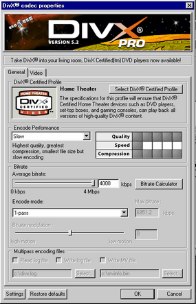 Выбирать битрейт желательно достаточно большим, не менее, чем в исходном видео. Но и больше 4000 Кбит/сек тоже указывать не стоит, иначе DVD-плеер может не справиться с таким потоком (4000 Кбит/сек это максимальное значение битрейта для профайла DivX Home Theater, которого "придерживается" большинство DVD-MPEG4 плееров).