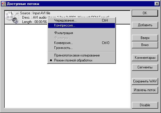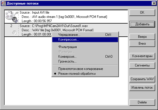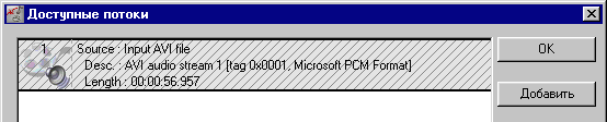 Оставаясь в окне "Доступные потоки" добавляем (кнопка "Добавить") еще один звуковой поток из полученного на 21-м Шаге WAV файла;