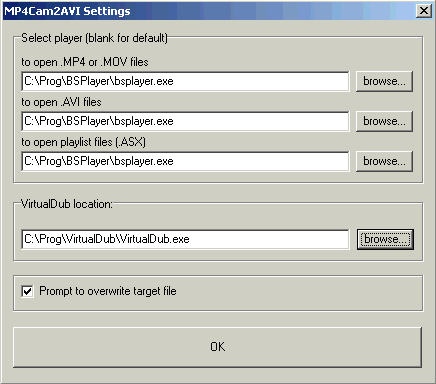 В верхних трех строках (и соответствующих им кнопках Browse) имеется возможность выбрать те программы, которые будут использоваться для просмотра соответственно исходных (MP4, MOV) файлов, смонтированного целевого AVI файла и предварительного просмотра выбранного списка файлов.