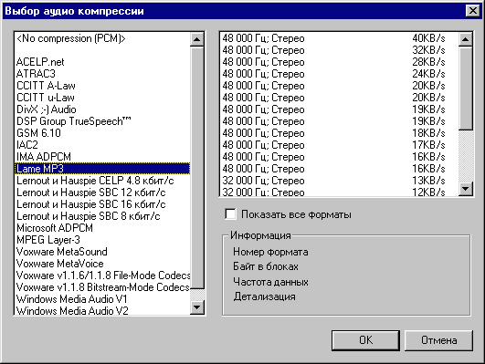 Примечание: Битрейт MP3 выбирается автоматически на основе частоты дискретизации и числа каналов, поэтому он не указан в явном виде.