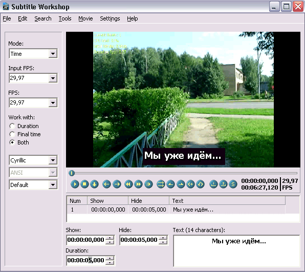Запускаем Subtitle Workshop, выбираем опцию "Cyrillic" (слева), чтобы правильно отображались русские буквы;