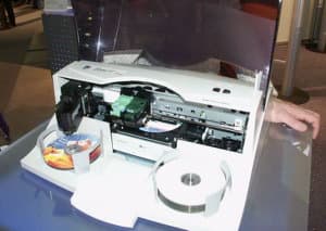 Стенд фирмы "CORVIS", украшенный штендером "нам 13 лет", содержал несколько приметных экспонатов. Один из них, напоминающий гибрид принтера с пишущим CD/DVD приводом, служил логическим дополнением тиражного комплекса для мелкосерийного производства дисков с 8 драйвами. Сейчас значительно возрос интерес к компактным системам тиражирования, очевидно, не без помощи видеопиратов.