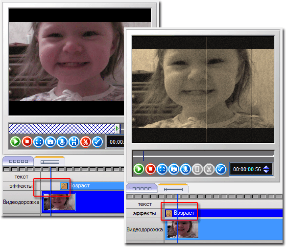 Эфекты здесь не накладываются непосредственно на клипы, а помещаются на специально предусмотренную для них дорожку таким образом, данный конкретный эффект присвоится лишь тому видео, которое находится строго под ним.