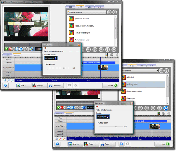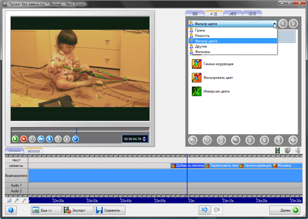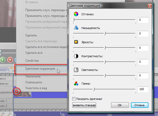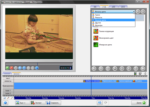 Эффектам и фильтрам в программе уделено немало внимания, всего в копилке насчитывается 71 эффект. К сожалению, подавляющее большинство из них рассчитано на простейшую деформацию кадра, инверсию цвета и т.п. Проделать какую-либо "нормальную" цветокоррекцию или наложить один фильтр на другой об этом даже не мечтайте. Более-менее достойный инструмент для работы с цветовым пространством скрыт не в копилке фильтров, как можно было бы ожидать, а в контекстном меню, выпадающем по нажатию на клипе правой кнопки мыши:
