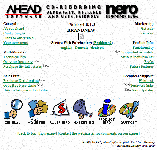А получилось с виду очень даже неплохо. По крайней мере у компании Ahead Software, родившейся в 1997 году в германском городе Карлсбад и рассказавшей тогдашнему небольшому интернет-миру cо своей первой web-странички о программе Nero Burning Rom.