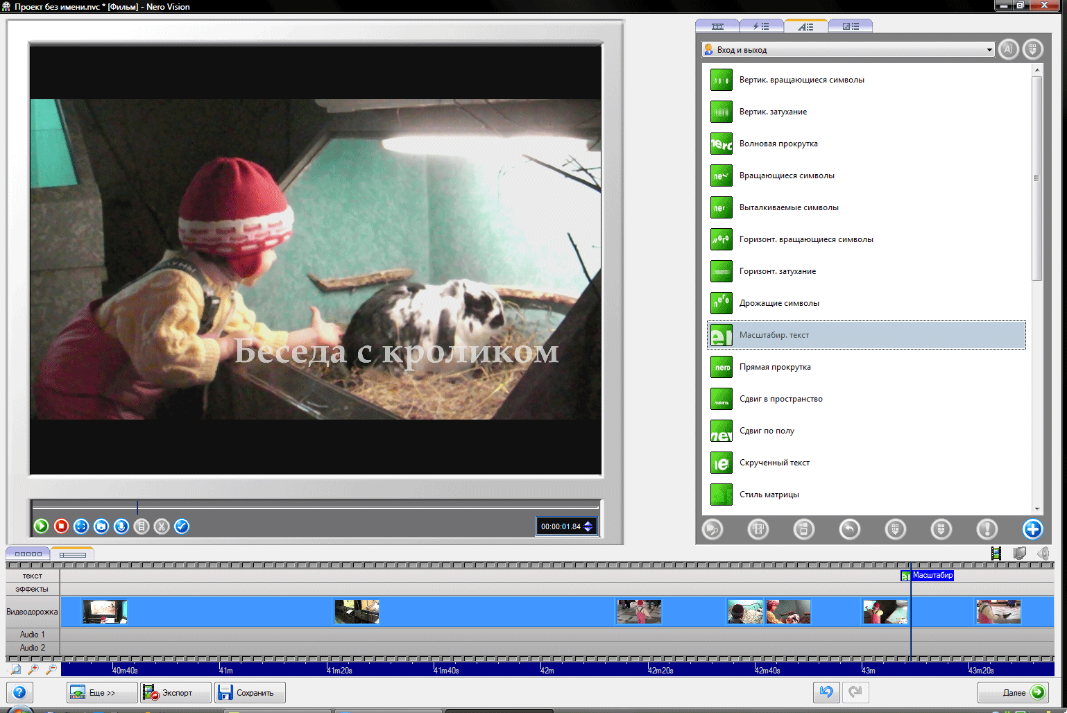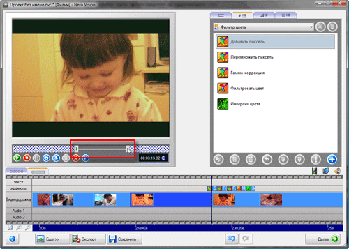 И точно так же, как во всех любительских комбайнах, в Nero напрочь отсутствует понятие формата проекта или таймлинии. Поясним: для того, чтобы редактируемый материал правильно отображался в окне просмотра, программе необходимо знать, какое видео пользователь желает получить в итоге. Особенно это касается соотношения сторон кадра и аспекта пикселя. Здесь же видео выводится всегда с соотношением сторон 4:3, а если в проекте присутствует широкоэкранное видео, то в окне просмотра мы видим черные полосы сверху и снизу. Пока что не совсем понятно, что же мы получим в итоге ну, как говорится, "будем посмотреть", и продолжим работу.