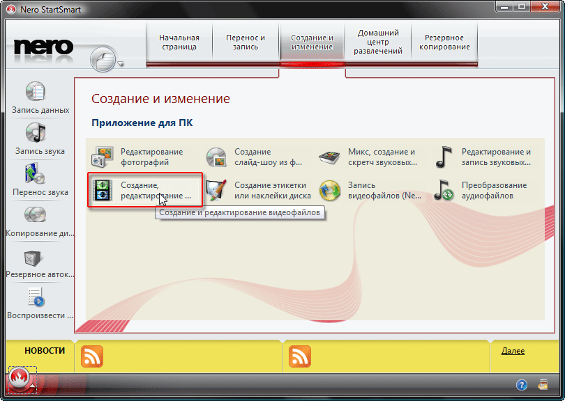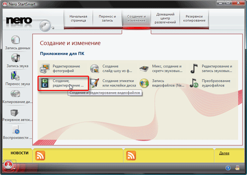 Пиктограмма с надписью "Создание и редактирование видеофайлов" то, что нам нужно (правда, непонятно, что помешало разработчику назвать пиктограмму тем же именем, каким названо приложение, запускаемое данной кнопкой).