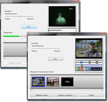 Вот мы и дошли до третьей кнопки с изображением динамика. Модуль, запускаемый этой кнопкой, называется Music Grabber. Его предназначение выявлять в анализируемом материале музыкальные клипы. Посмотрим, как это работает. Добавим к звуковой дорожке нашей измученной опытами телепередачи три мелодии разных жанров: попсовую C.C. Catch, серьезных Rolling Stones и разудалую композицию группы Парк Горького.
