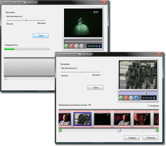 Хорошо, с Movie Wizard мы разобрались, но что же скрывается под остальными двумя пиктограммами? Иконка, изображающая телевизор это Add Spotter, блокировщик рекламы. По заявлениям разработчика, данный модуль позволяет выявить и удалить из видеоклипа рекламные вставки (речь идет о видео, захваченном с телевизора обыкновенной телепрограммы). Помнится, мы уже разбирались с подобным модулем, встроенном в программы Ulead VideoStudio 11 Plus и Ulead MediaStudio Pro 8. В итоге несложных изысканий мы выяснили, что данные модули в своей работе ориентируются исключительно на уровень звука: высокий его уровень программа считает рекламой. Не поленимся, и понаблюдаем за работой блокировщика рекламы в Nero Vision вдруг за пару лет что-то сдвинулось с мертвой точки?