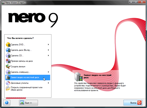 Нажатием этой пиктограммы запускается Nero Vision. Хорошо, хоть здесь монтажер видит что-то знакомое. Захват видео с этого следует начинать любую работу, если у вас кассетная видеокамера или устройство захвата аналогового видео (тюнер, вебкамера и т.п.).