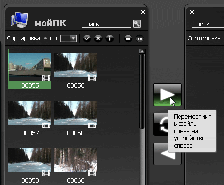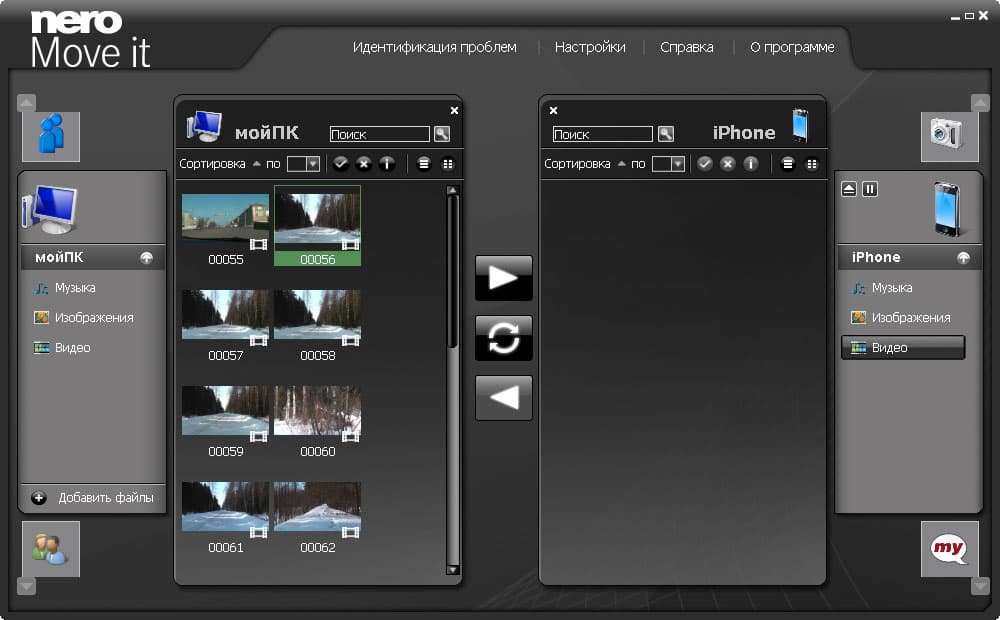 Работу в программе вряд ли можно назвать работой. От пользователя требуется лишь добавить в библиотеку программы папку с файлами, которые он хочет перенести на устройство. Миниатюры этих файлов шустро отображаются в соответствующем окне программы. При переносе файлов на устройство или с устройства рабочее пространство Nero Move it выглядит примерно так: