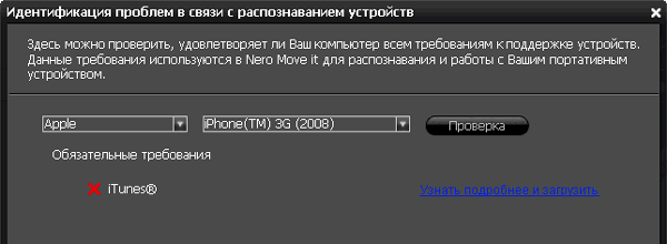 И немудрено, ведь запустив встроенный в Nero Move it инструмент идентификации проблем, мы сразу же видим причину неудачи: отсутствие установленного iTunes.