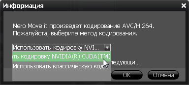 Очень просто: в тот момент, когда пользователь нажимает заветную кнопку со стрелкой, указывающей направление переноса файла, появляется диалоговое окно с предложением использовать один из двух типов кодирования: с использованием технологии NVIDIA CUDA или "классический", с помощью центрального процессора.