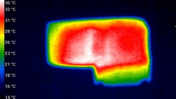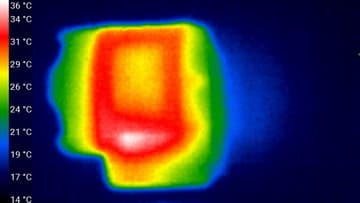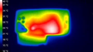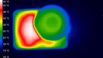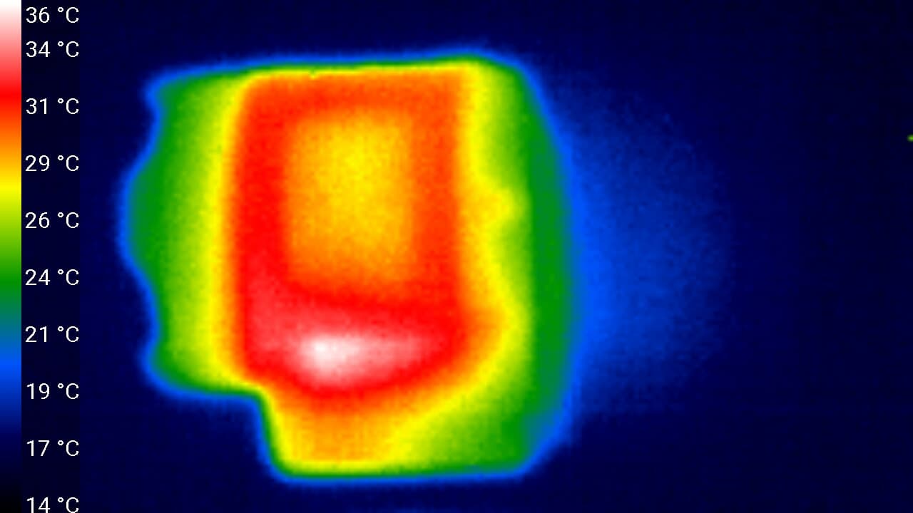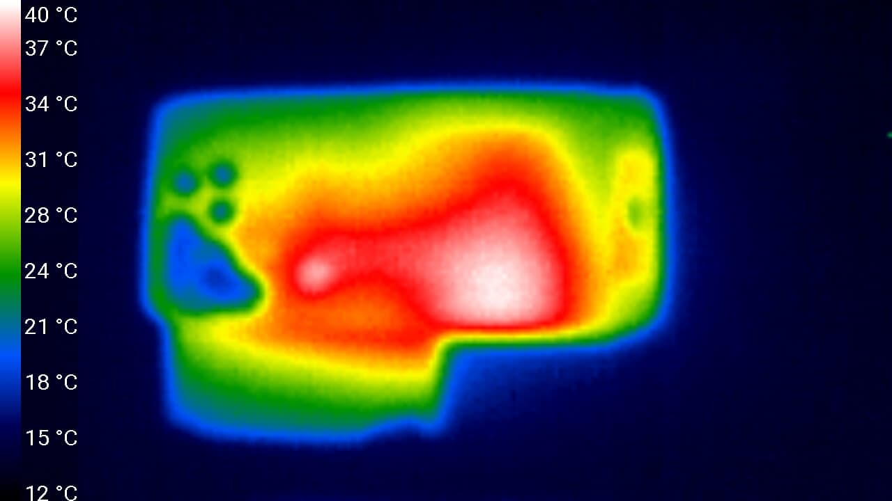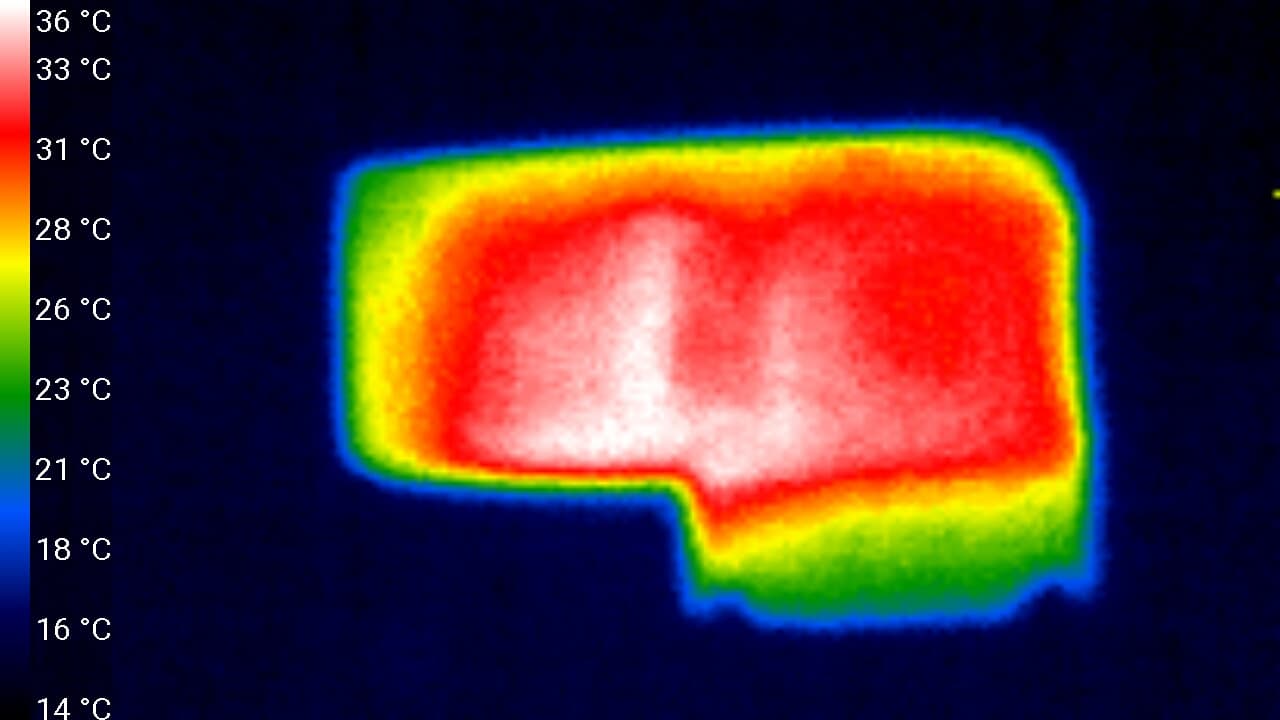 Следующие теплоснимки были получены во время работы камеры после длительной видеозаписи в режиме 4K, сразу после очередной аварийной остановки записи. Можно видеть, что некоторые участки корпуса нагрелись до 46 °C. Однако имеется подозрение, что внутренние элементы камеры — датчик изображения и вся аппаратная обвязка — нагреваются значительно сильнее, ведь корпус аппарата герметичен.