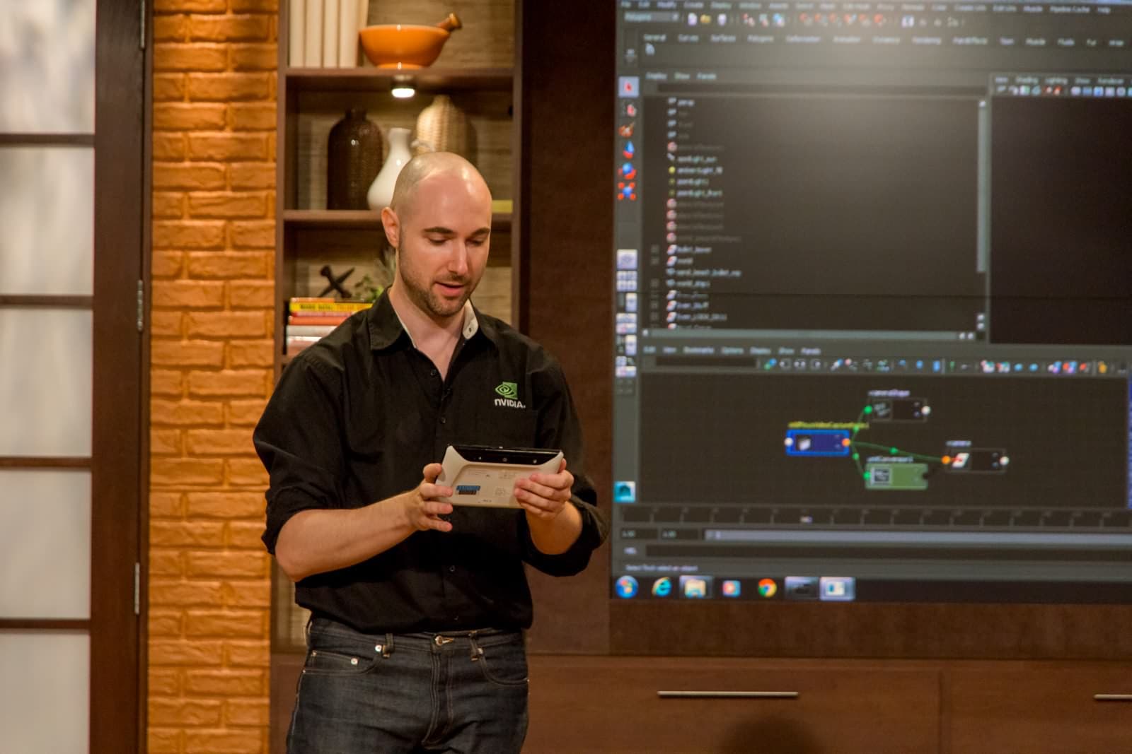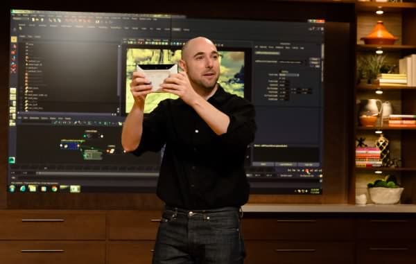 Wil Braithwaite, старший инженер отдела прикладных исследований Nvidia, провел демонстрацию, которую также увидели посетители SIGGraph 2014. Симбиоз планшета на процессоре Nvidia Tegra и рендеринг 3D-сцены в реальном времени на Quadro дает новые перспективные возможности. При создании анимационных 3D-фильмов одна из проблем — поиск нужного плана, ракурса, положения камеры относительно главного героя. Для общего, ближнего, среднего, крупного планов часто необходимо расставить несколько камер и переключаться между ними, как при натурной съемке реального кино. Это кропотливая и нетворческая работа, которую приходится выполнять средствами 3D-редактора.