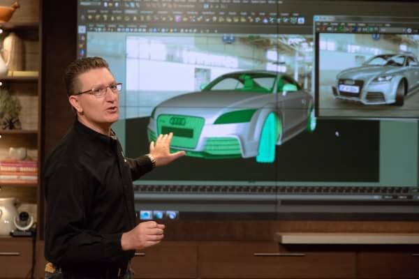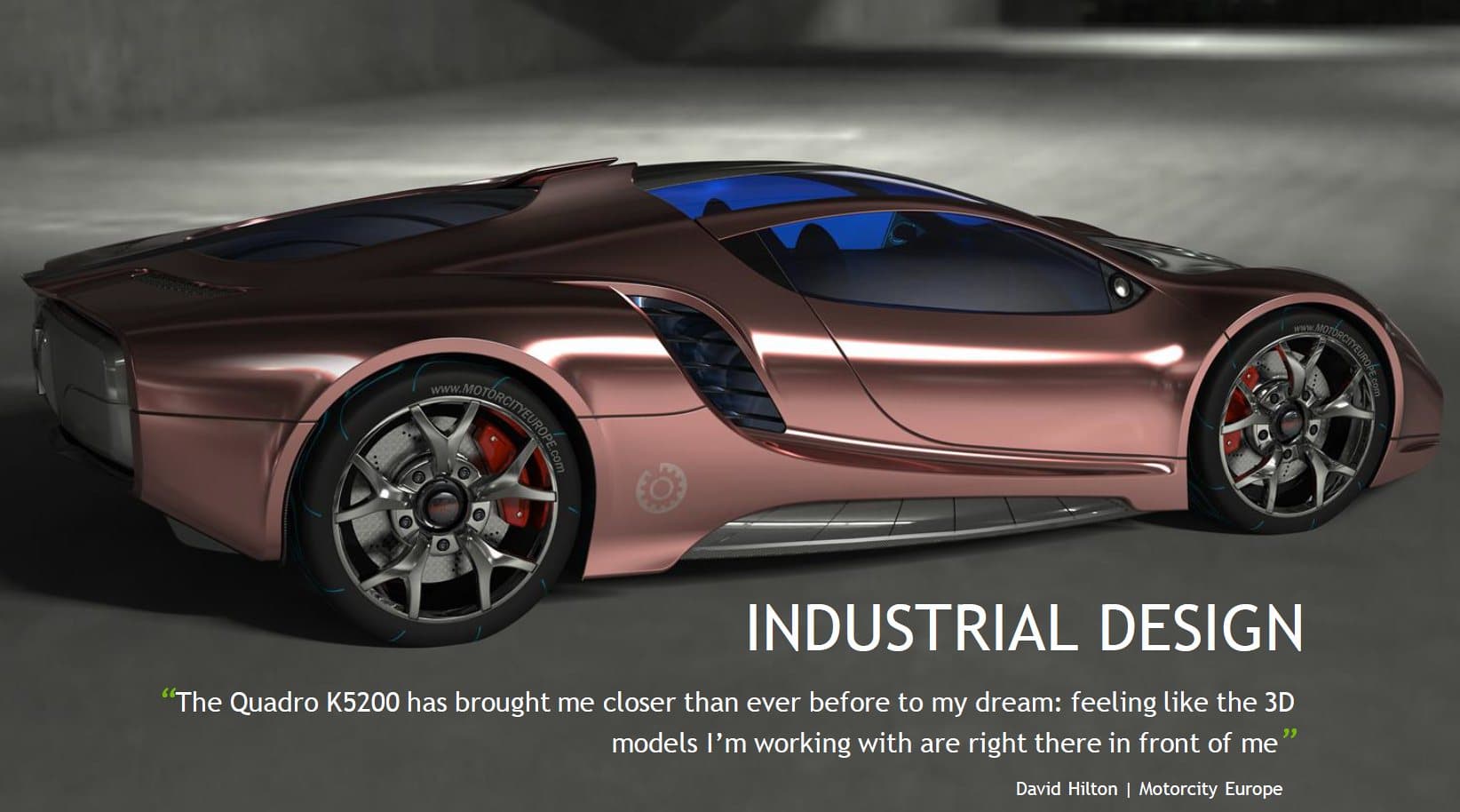 David Hilton, в прошлом главный дизайнер Bentley Motors, ныне основатель собственной компании MotorCity Europe, рассказал, что сегодня особенно важно проектировать дизайн автомобилей точно в срок, с минимальными затратами и максимально выгодно представлять результаты своего труда заказчику. На слайде процитированы слова Дэвида: «Только с моделью Quadro K5200 у меня стало появляться ощущение, о котором я всегда мечтал, что 3D-модели, над которыми я работаю, находятся прямо здесь, передо мною».