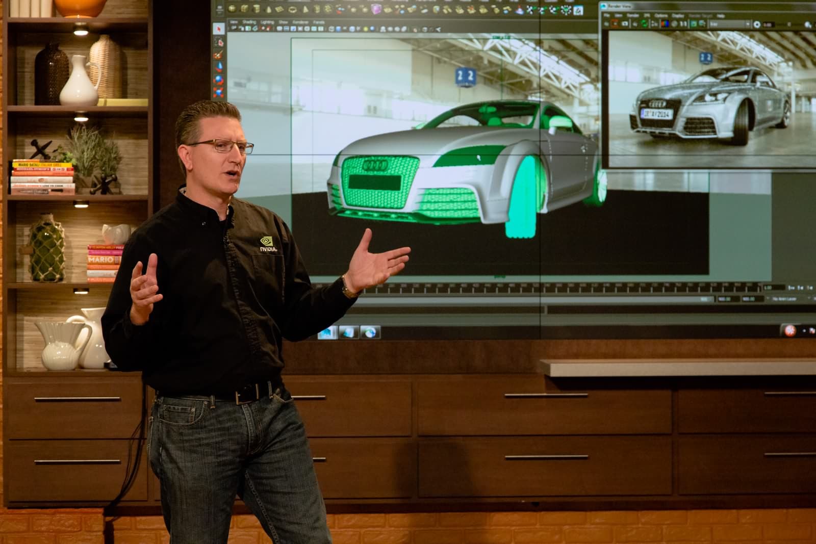 Презентацию начал Sandeep Gupte, глава маркетинга профессиональных решений Nvidia. Он рассказал, что потребности профессионалов возросли. И дело не только в увеличении разрешения экрана. Конструкторы, разработчики и дизайнеры сегодня хотят работать не с упрощенными моделями и каркасами, а с полноценными детализированными изображениями, чтобы сразу контролировать финальный результат. Чтобы сразу видеть абсолютно все тени, блики, отражения, оценить реальные материалы, иметь возможность приближаться к интересующему участку и рассмотреть все детали вблизи. Также на этапе разработки хочется моделировать и анализировать поведение моделей, чтобы понять, как они будут себя вести в реальной жизни. Особенно это касается CAD/CAM-систем и промышленного дизайна.