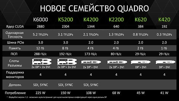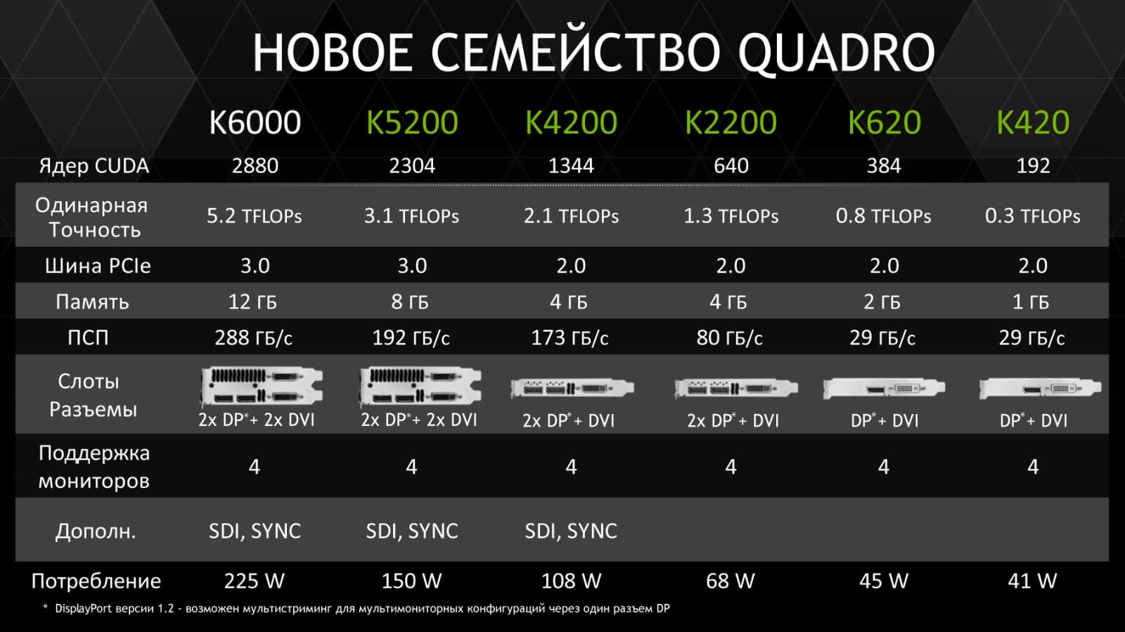 Младшие модели линейки, K420 и K620, пришедшие на смену K410 и K600 — это низкопрофильные экономичные модели для узкого отраслевого применения, поэтому они остаются за рамками нашего интереса. Мы не будем на них останавливаться. Дополнительную информацию всегда можно найти на официальном сайте компании.