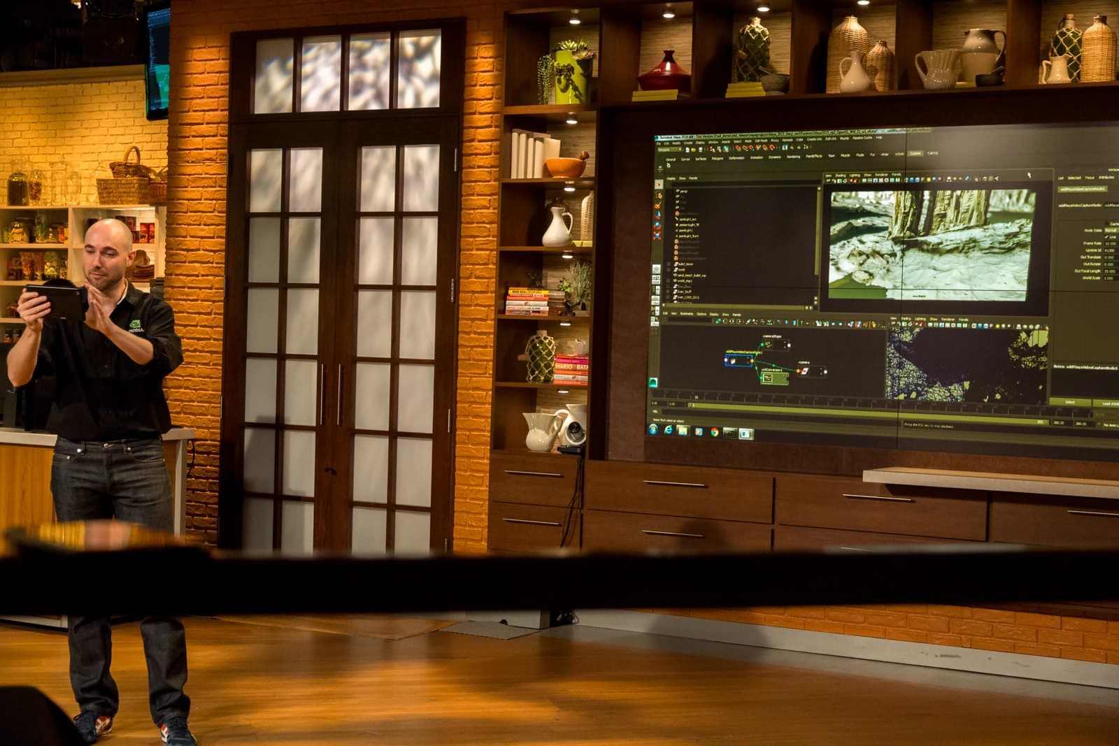 Наш снимок широкоугольным объективом немного раскрывает секреты освещения студии: импровизированные софтбоксы из стандартных светильников со шторками и пергамент на канцелярских прищепках. На полу — стандартная разметка: где следует стоять ведущим и куда смотреть, чтобы попасть точно в камеру. Ничего сверхъестественного, зато какой прекрасный результат! На заднем плане видны огромные счетверенные экраны, с матричным выводом картинки. Экраны матовые, больше похожи на проекционные DLP-телевизоры, поэтому при короткой выдержке фотоаппарата часть цветов не экспонируется. Фотографирование такой презентации с рук представляет серьезную техническую проблему. Слишком короткая выдержка теряет цвета экрана, слишком длинная — дает смаз движения докладчиков. Помогает только режим серийной съемки при 1/30-1/60 секунды объективом со стабилизацией и отбор удачных кадров, где докладчик мало двигался. Съемка экранов без докладчика никаких проблем, разумеется, не вызывает.