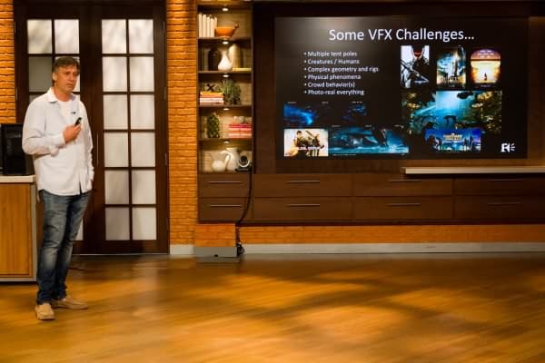 Далее выступил Steve MacPherson, главный по технологиям студии Framestor, производящей спецэффекты для Голливуда. На YouTube-канале FramestoreOfficial можно посмотреть подробные видеоролики о производстве эффектов для оскароносных кинофильмов. Забавный момент: Стив поделился с нами главной, на его взгляд, проблемой в их сфере — ожидания зрителей (и продюсеров) растут с каждым новым фильмом. Стоит чуть-чуть где-то недоработать, с освещением или свойствами материалов, и компьютерная графика сразу выглядит ненатурально. Поэтому специалисты по спецэффектам всегда используют все самые последние вычислительные технологии, все самое мощное железо и софт, невзирая на их цену. И они же работают в тесной кооперации с лидерами рынка, постоянно высказывая свои пожелания. Судя по результату, от этого взаимодействия есть толк.