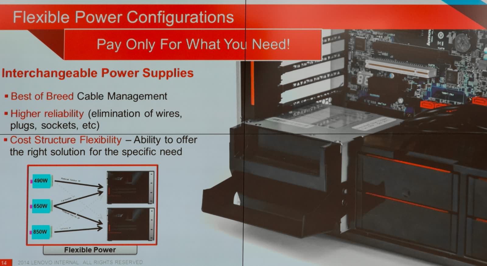 Как мы видим, внутри нет никаких болтающихся проводов. Наши вопросы вызвали два маленьких вентилятора в БП. Представитель компании пояснил, что, во-первых, их наличие обусловлено стандартным форм-фактором. Во-вторых, в рабочих станциях Lenovo вентиляторы в БП больше по размеру, чем у конкурентов. И там, где позволяет размер, конечно же стоят большие низкооборотистые вентиляторы. К уровню шума сейчас предъявляются повышенные требования, и Lenovo в этом аспекте может предложить на 40% менее шумящие рабочие станции, чем у конкурентов.