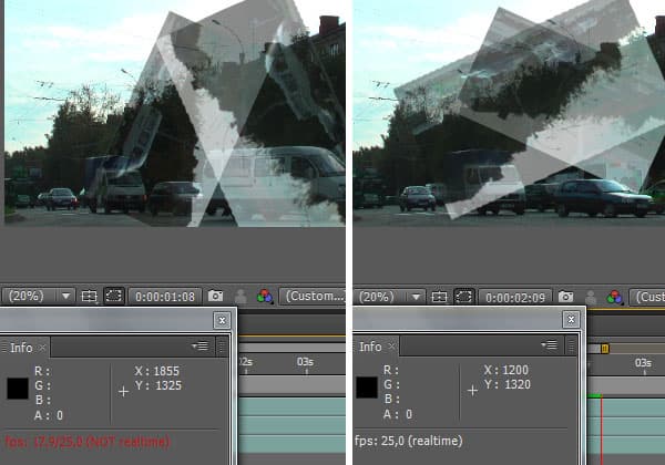 Похожий результат наблюдается и в After Effects. Хоть и богатырь наш Q9300, а всё же не дотягивает до способностей симбиоза Quadro CX и RapidHD. Ну никак не удается ему без предварительного просчёта проиграть издевательски построенную сцену.