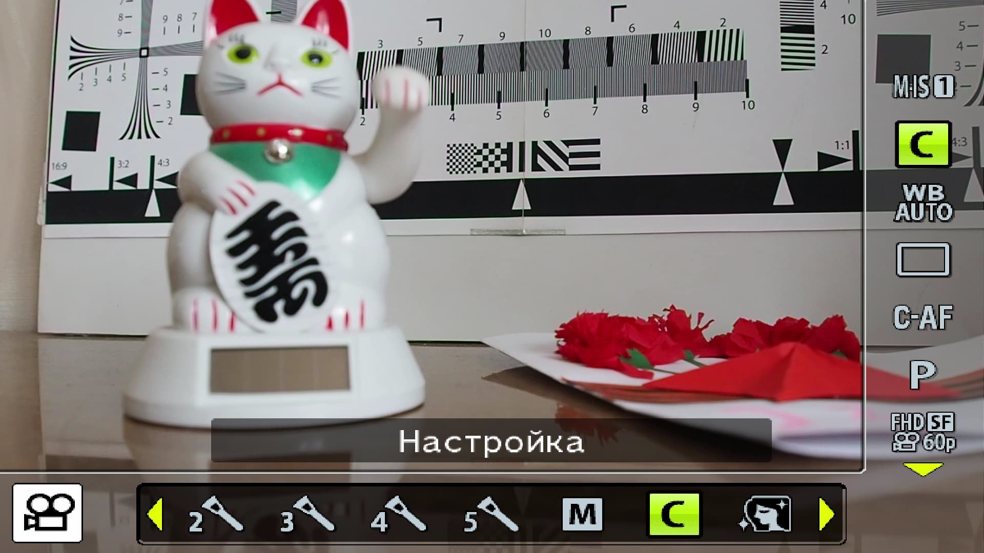 Два колеса регулировки, расположенные на правой верхней части корпуса, предоставляют возможность оперативного изменения параметров экспозиции, но с непривычки трудно понять, как регулировать эти параметры непосредственно во время съемки: возникает ощущение, словно при старте записи все параметры, кроме фокуса и зума, блокируются. На самом деле доступ к прочим параметрам осуществляется либо через скрытое справа меню на сенсорном дисплее, либо нажатием кнопки ОК с последующим вращением регулировочных роликов. Речь идет, конечно, о съемке с ручными настройками (на «полном автомате» экспозиция изменяется автоматически).