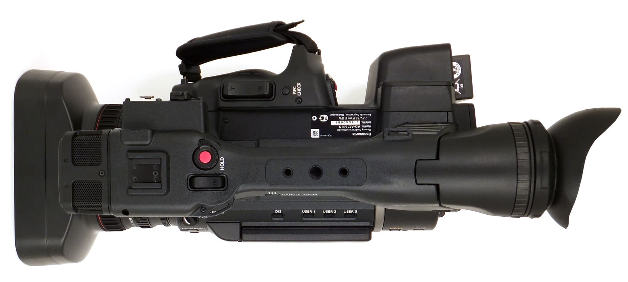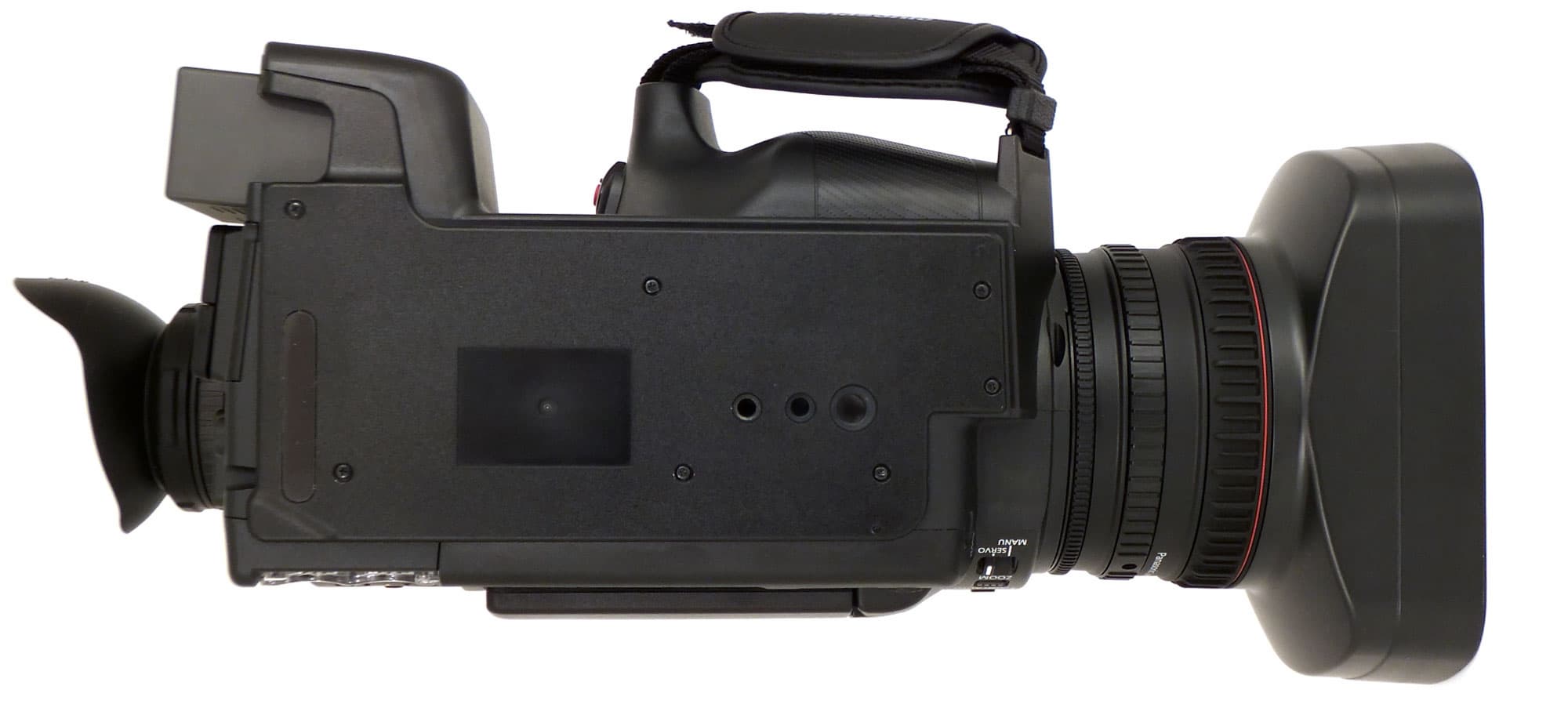 Под откидывающимся ЖК-экраном на корпусе камеры расположены кнопки, активирующие отображение цветовой мишени; EVF, подчёркивающая контуры изображений, что облегчает фокусировку; пятиступенчатая кнопка регулировки яркости дисплея; кнопки счётчика и сброса; кнопка включения и настройки уровня зебры; кнопка активации векторного отображения сигнала. Правее находится блок кнопок, предназначенных для работы со звуком: переключение источников, переход из автоматического в ручное управление уровнем звука. В верхней части корпуса имеется кнопка OIS, включающая и отключающая оптический стабилизатор изображения, и три пользовательских кнопки, каждой из которых можно присвоить различные функции.