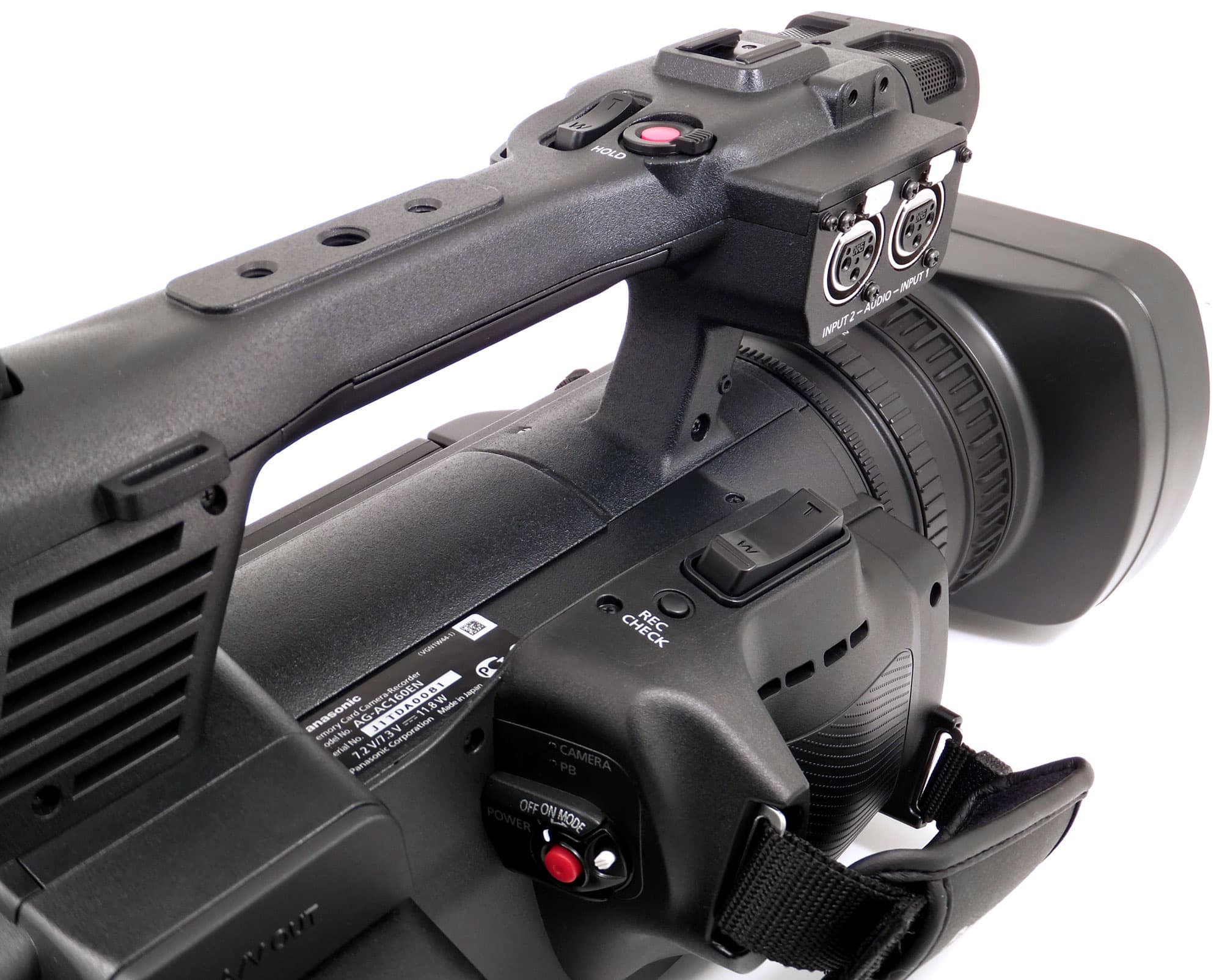 Назначение поворотного рычага с фиксатором и красной кнопкой в центре не требует расшифровки, в отличие от функции кнопки REC CHECK, расположенной рядом с качалкой зума. Она предназначена для быстрого просмотра видео со звуком, записанного за три секунды до приостановки записи. Этакий быстрый контроль записанного. Если последний записанный клип не удовлетворяет, то его можно быстро удалить (для этого заранее назначьте функцию удаления последнего клипа на одну из пользовательских кнопок USER). Трёхконтактные XLR-разъёмы для подключения микрофонов находятся на блоке с правой стороны рукоятки. Верх рукоятки венчают дублирующая качалка зума, кнопка REC, стандартный «башмак» и отверстия для крепления держателей микрофонов или опциональных накамерных видоискателей большей диагонали.