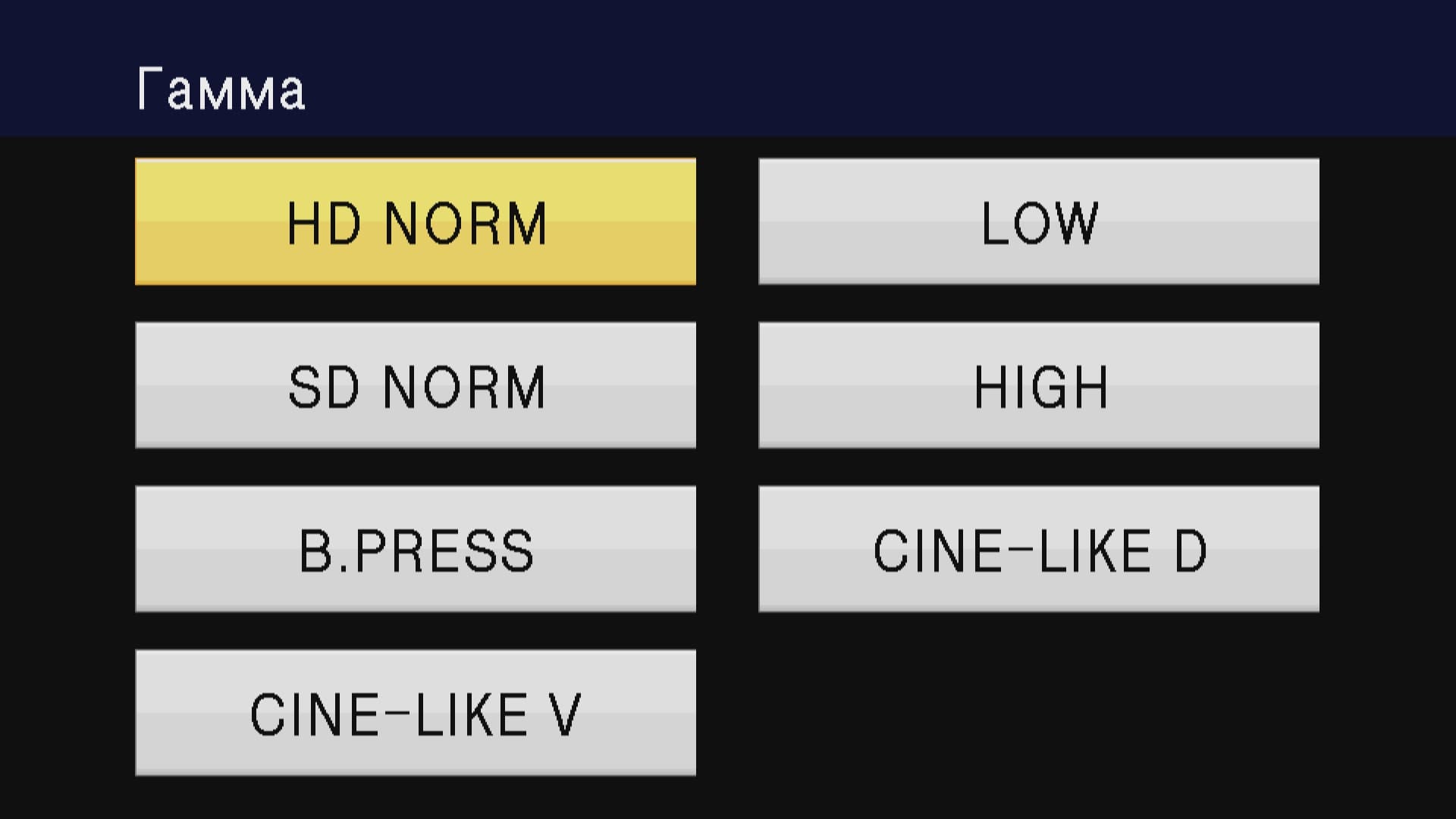 Прежде всего поговорим о гамме. Данная функция является коньком профессиональных камер, изменение этого параметра зачастую приводит к значительным переменам в получаемой картинке. Настройки CINELIKE Gamma прячутся в служебном меню и состоят из семи пресетов (предустановок):