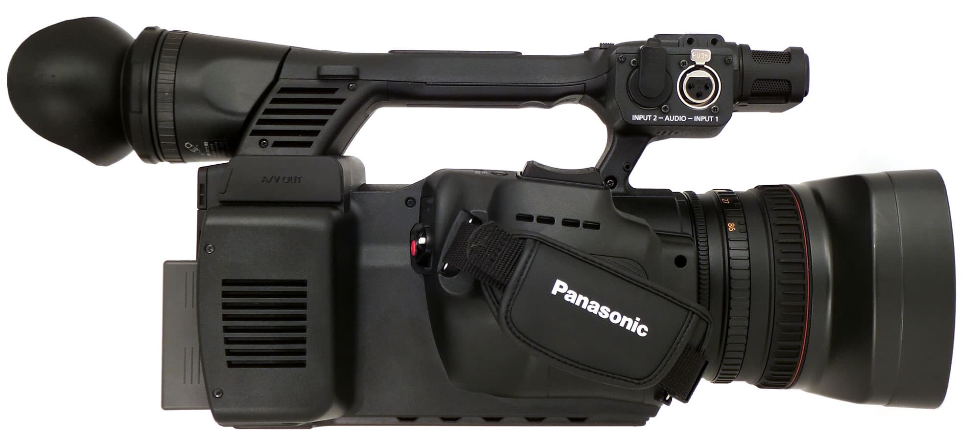 Верхняя часть корпуса камеры выполнена в виде рукоятки, стандартной для аппаратов проф. класса. Вперёд выступает модуль, содержащий встроенные стереомикрофоны (звук, записываемый ими, нам показался чуть глуховатым, но с хорошими низкими частотами), индикатор записи, а также скрытые под чёрным стеклом датчик естественного света и инфракрасный датчик, улавливающий сигналы пульта ДУ. Под объективом на корпусе имеется глядящая вперёд кнопка AWB, нажатие на которую приводит к подстройке баланса белого (запомним эту кнопку, она нам ещё понадобится).