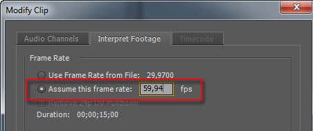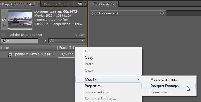 В итоге всех этих операций камера станет снимать видео с выставленной частотой кадров. Однако впереди очередная трудность: свойства полученного файла не соответствуют его реальным характеристикам. То есть, несмотря на то, что видео снято с частотой 60 кадр/сек, воспроизводиться в любом плеере оно станет с частотой 30 — вдвое медленнее. Для того, чтобы получить «настоящие» 60p, придётся помудрить. Это можно сделать, например, в монтажной программе Adobe Premiere Pro. Щёлкнув на файле правой кнопкой мыши, нужно выбрать из выпадающего меню команду Modify → Interpret Footage, и в появившемся окне ввести новые значения:
