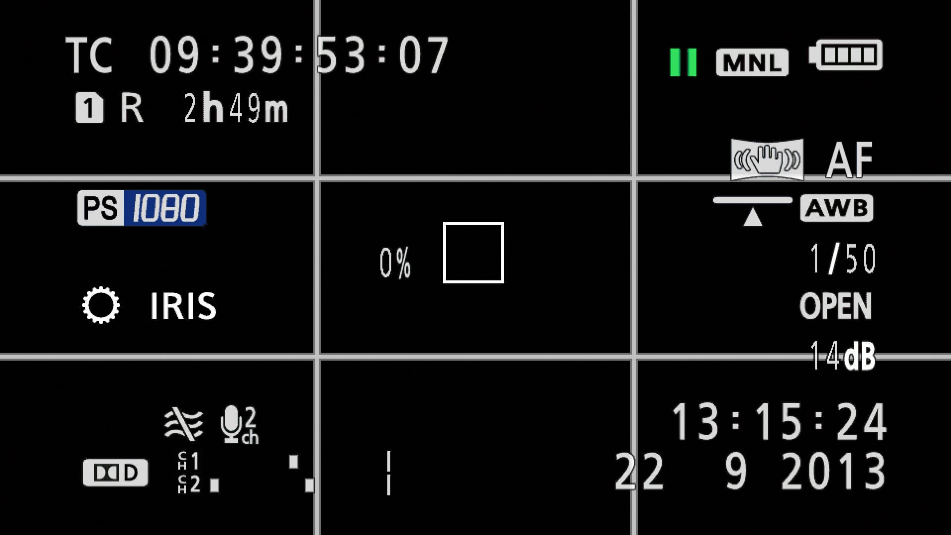 ЖК-экран камеры достаточно информативен, чтобы оператор всегда был в курсе текущего таймкода, времени, используемого режима, настроек, уровня микрофона и т. д. Многочисленные настройки камеры позволяют вывести на экран дополнительные функции, например, помощника по фокусировке, зебру и гистограмму.